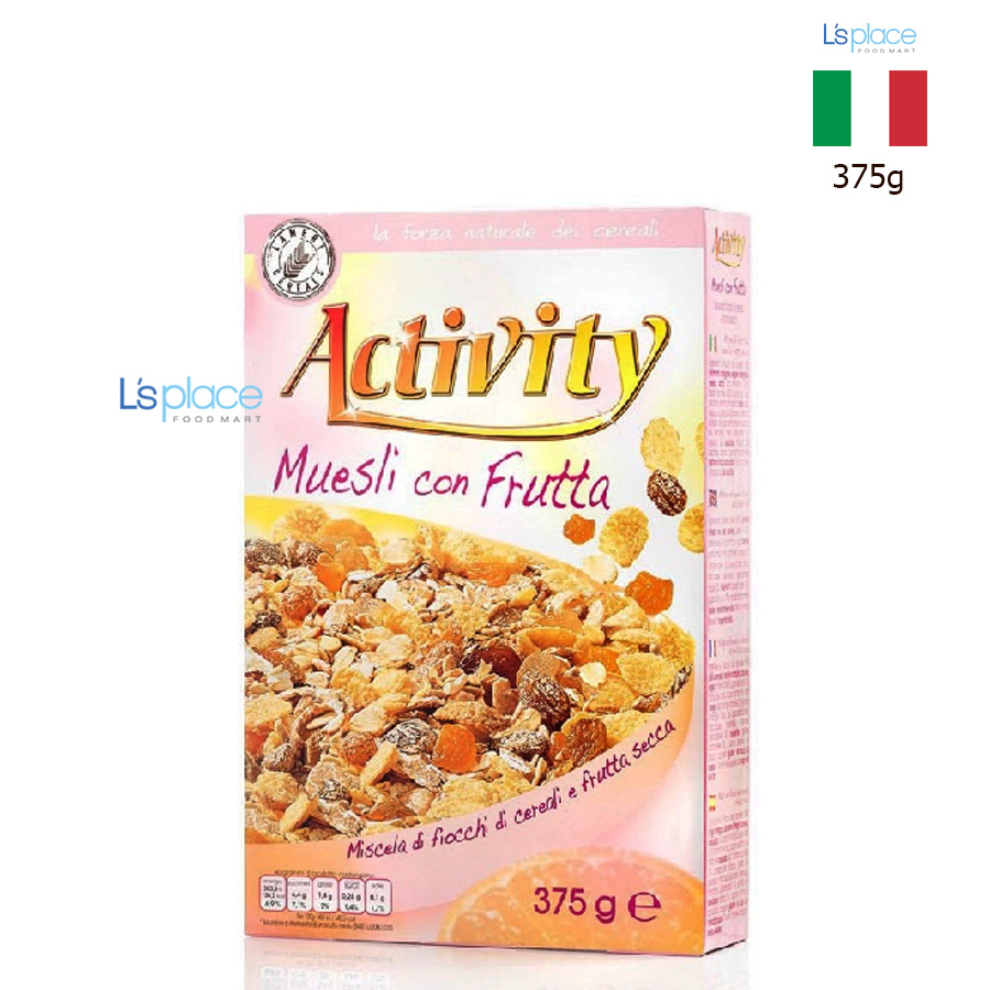 - Ngũ cốc Activity Muesli Con Frutta là một sản phẩm ăn sáng cao cấp đến từ thương hiệu Lameri của Ý. "Muesli" là một loại ngũ cốc trộn đặc trưng của Thụy Sĩ, thường bao gồm yến mạch, các loại hạt và trái cây sấy khô. "Con Frutta" trong tiếng Ý có nghĩa là "với trái cây", cho thấy sản phẩm này đặc biệt chú trọng vào việc kết hợp ngũ cốc với trái cây.
