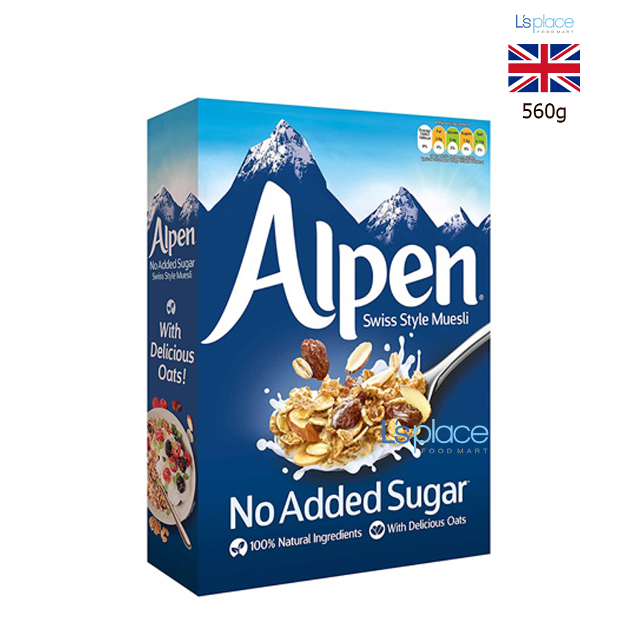 - Alpen là thương hiệu ngũ cốc nổi tiếng thuộc tập đoàn Weetabix Food Company, có trụ sở tại Anh Quốc. Ra đời từ những năm 1970, Alpen được truyền cảm hứng từ công thức Muesli truyền thống của Thụy Sĩ (Swiss Style). Tập trung vào sự cân bằng giữa hương vị tự nhiên và giá trị dinh dưỡng cao. Đây là một trong những thương hiệu Muesli bán chạy nhất thế giới, nổi tiếng với việc không sử dụng màu nhân vật hoặc chất bảo quản độc hại.Thành phần: