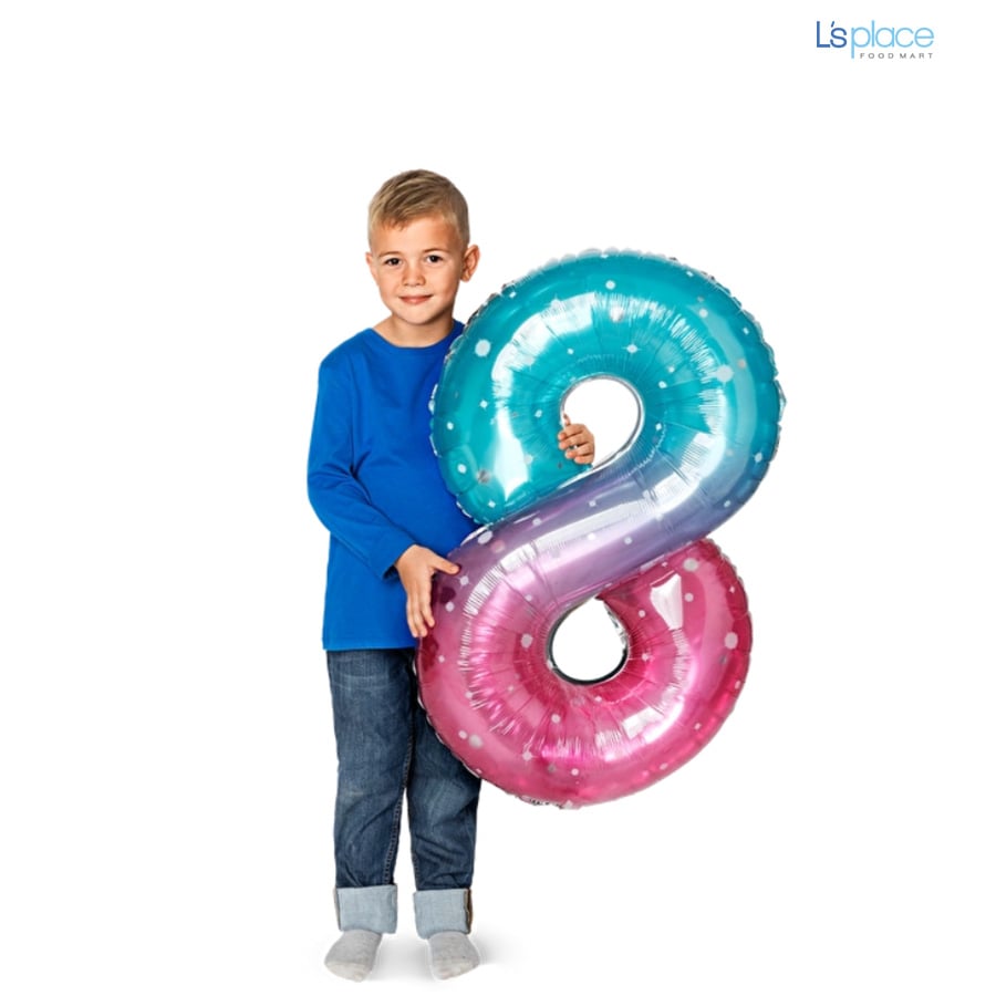 Bóng bay khổng lồ số 8 với thiết kế màu hồng và xanh bóng bẩy là lựa chọn hoàn hảo để trang trí cho các buổi tiệc sinh nhật, lễ kỷ niệm hoặc sự kiện đặc biệt. Kiểu dáng số 8 nổi bật kết hợp cùng gam màu tươi sáng giúp không gian trở nên sinh động, vui tươi và đầy thu hút.