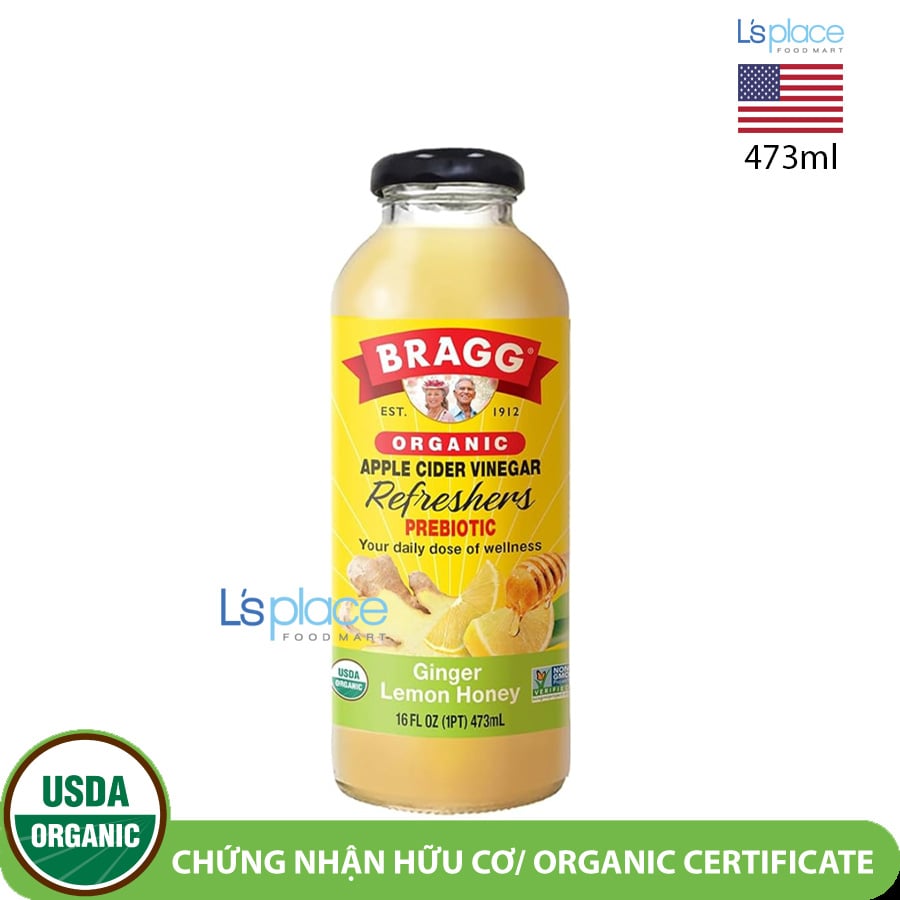 Bragg Organic Apple Cider Vinegar Prebiotic Refresher Ginger Lemon Honey là nước uống giấm táo hữu cơ kết hợp hương vị gừng, chanh và mật ong tự nhiên, mang lại vị chua ngọt dễ uống và sảng khoái. Sản phẩm cung cấp lượng giấm táo (ACV) vừa đủ trong mỗi khẩu phần, hỗ trợ tiêu hóa và bổ sung lợi khuẩn prebiotic cho đường ruột.