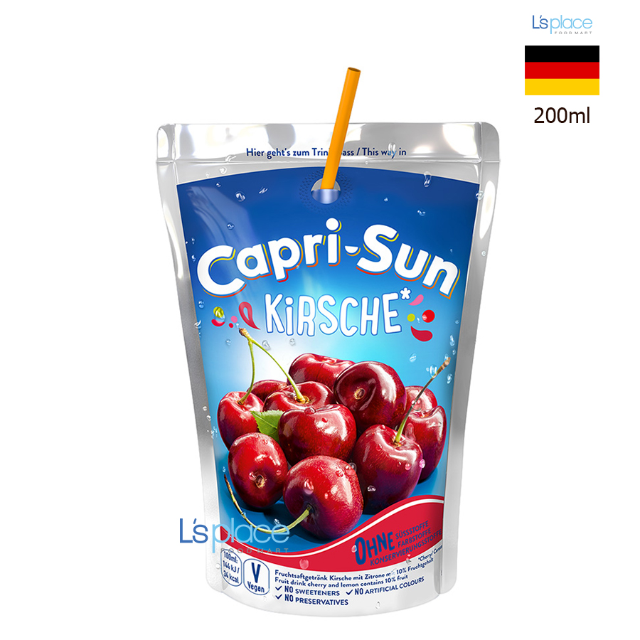 - Capri-Sun (đôi khi được gọi là Capri Sonne ở một số thị trường trước đây). Thương hiệu này có nguồn gốc từ Đức (Sản xuất bởi Capri Sun Vertriebs GmbH hoặc các công ty nhượng quyền khác trên toàn thế giới). Capri-Sun nổi tiếng với các loại nước giải khát trái cây đóng gói dạng túi tiện lợi (pouch), thường hướng đến đối tượng trẻ em. Các sản phẩm của Capri-Sun thường được quảng bá là không chứa màu nhân tạo, hương vị nhân tạo, hoặc chất bảo quản, nhờ vào quy trình đóng gói đặc biệt. "Kirsche" trong tiếng Đức có nghĩa là Anh Đào (Cherry). Đây là một hương vị nước ép trái cây phổ biến của hãng.Thành phần:
