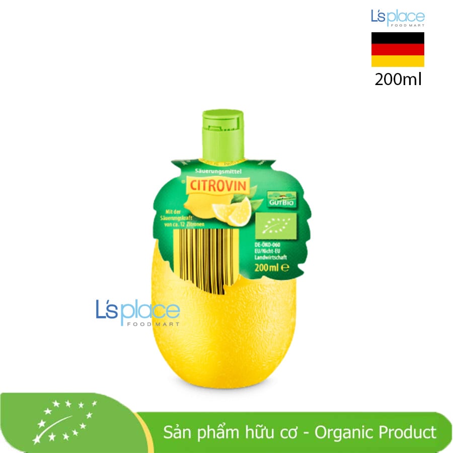 GUT BIO Bio-Citrovin là nước chanh vàng hữu cơ cô đặc, có công dụng đa năng và hiệu quả tương đương chanh tươi. Sản phẩm được làm từ chanh vàng hữu cơ, mang vị chua tự nhiên, hương thơm dễ chịu và tiện lợi khi sử dụng. Một chai Bio-Citrovin 200ml có khả năng làm chua tương đương khoảng 12 quả chanh vàng, phù hợp cho nấu ăn, pha chế và sử dụng hằng ngày.
