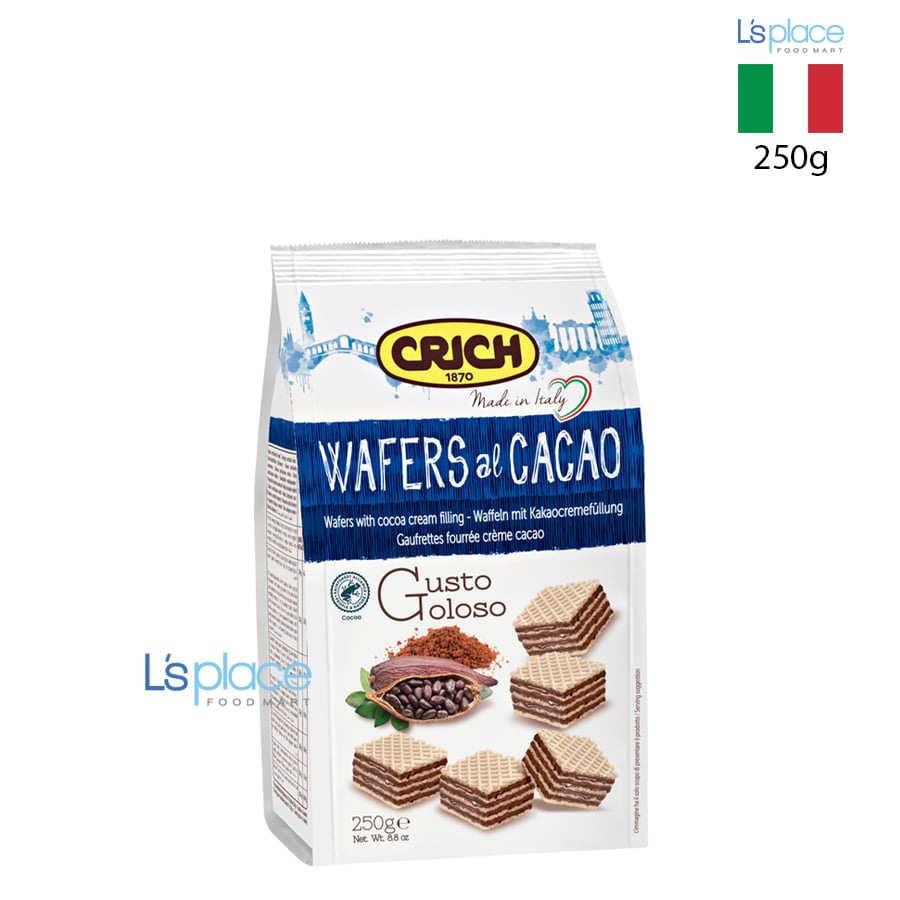 Crich Wafers al Cacao là bánh xốp kẹp kem ca cao thơm ngon, mang hương vị đậm đà và đặc trưng của socola Ý. Bánh gồm nhiều lớp wafer giòn nhẹ xen kẽ lớp kem cacao mịn béo, tạo nên sự cân bằng hoàn hảo giữa vị ngọt dịu và vị đắng nhẹ của cacao nguyên chất. Sản phẩm được làm từ nguyên liệu tự nhiên, không chứa dầu cọ, phẩm màu hay chất bảo quản, thích hợp dùng làm món ăn vặt, tráng miệng hoặc thưởng thức cùng cà phê, sữa.