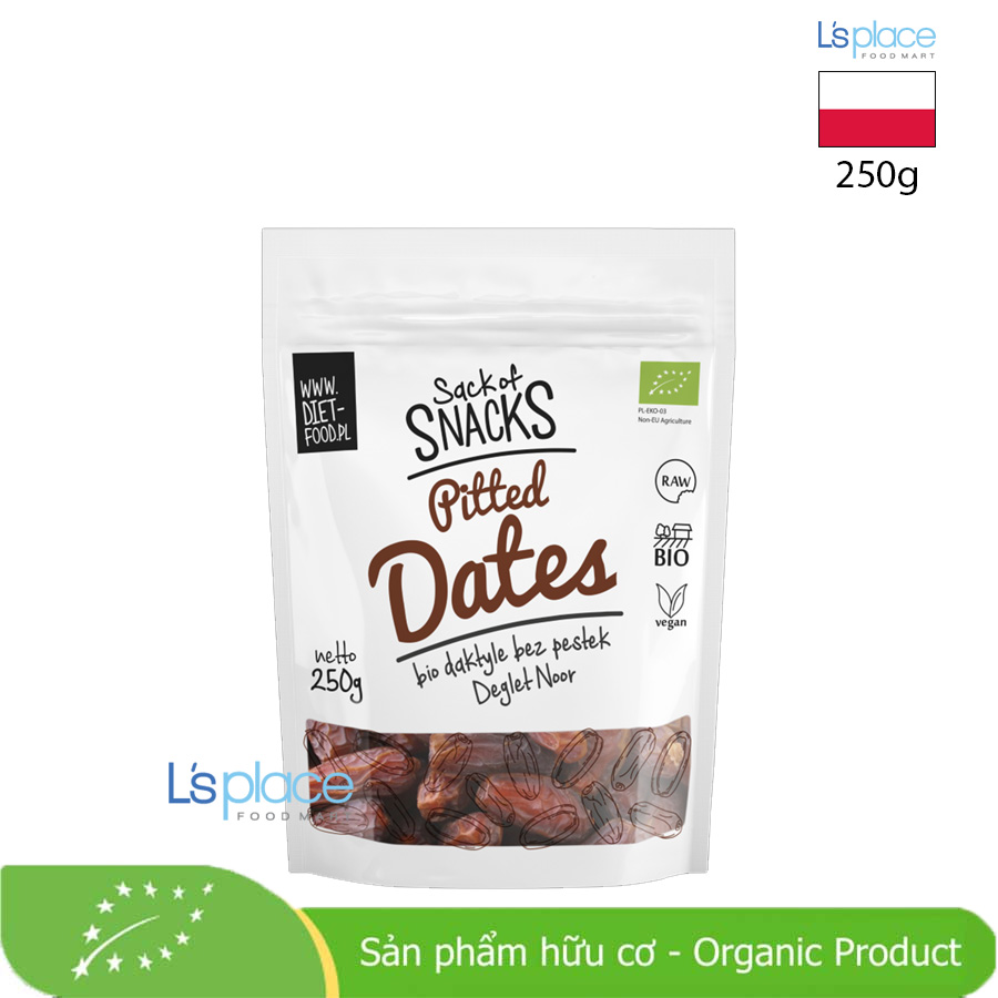 Diet Food Pitted Dates 250g là sản phẩm chà là hữu cơ đã bỏ hạt, giữ nguyên vị ngọt tự nhiên và giàu năng lượng. Chà là là nguồn cung cấp chất xơ, vitamin nhóm B, kali, magie và chất chống oxy hóa, giúp bổ sung năng lượng nhanh chóng, hỗ trợ tiêu hóa và tăng cường sức khỏe tổng thể. Đây là lựa chọn lý tưởng cho bữa ăn nhẹ lành mạnh, làm ngọt tự nhiên cho món tráng miệng, sinh tố, yến mạch hoặc dùng trong chế biến bánh kẹo.