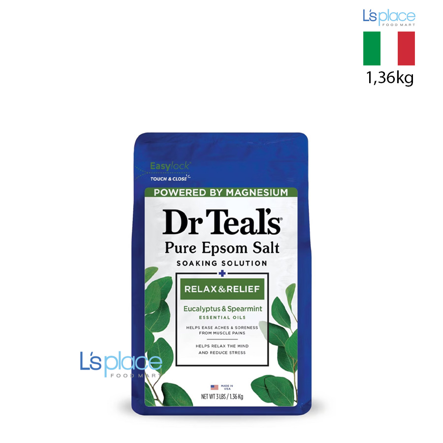 Dr. Teal’s Pure Epsom Salt Eucalyptus & Spearmint là muối tắm tinh khiết chứa magie sunfat tự nhiên kết hợp tinh dầu khuynh diệp và bạc hà. Sản phẩm giúp thư giãn cơ thể, giảm căng thẳng và hỗ trợ làm dịu cơ bắp sau một ngày dài hoạt động. Hương khuynh diệp tươi mát cùng bạc hà thanh khiết mang lại cảm giác sảng khoái, đồng thời giúp làm sạch và nuôi dưỡng làn da mềm mại, mịn màng hơn.