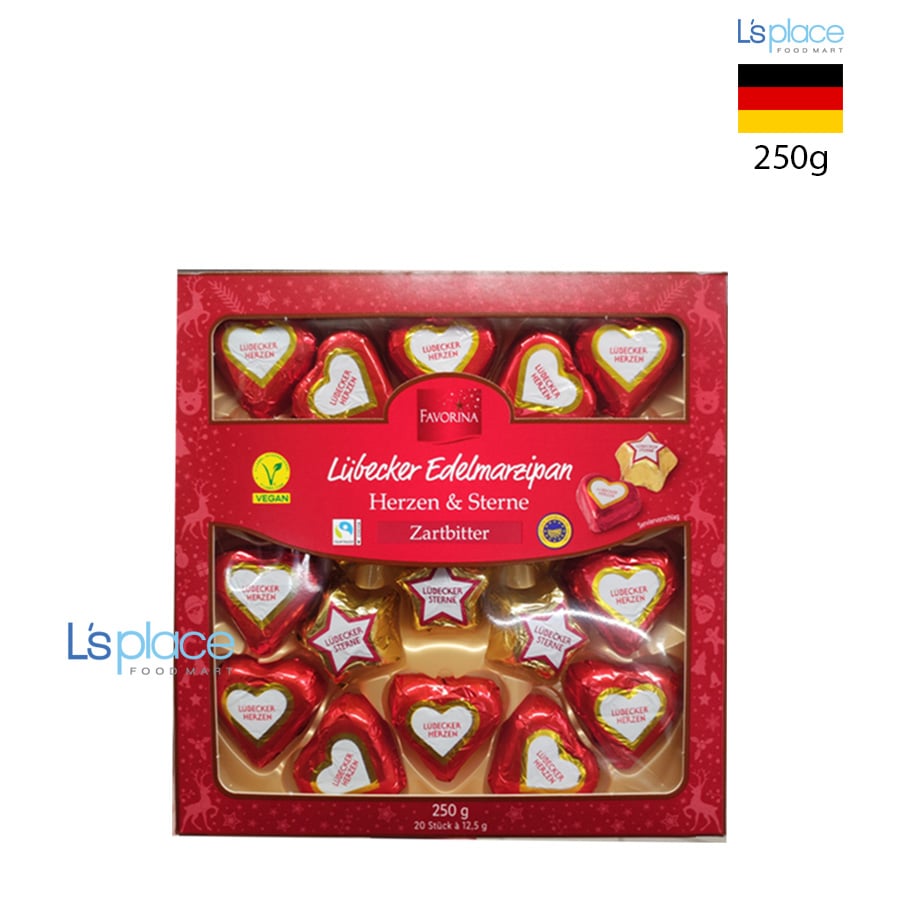 - Favorina là một thương hiệu riêng nổi tiếng thuộc tập đoàn bán lẻ Lidl (Đức). Thương hiệu này chuyên về các dòng bánh kẹo cao cấp, đặc biệt là các sản phẩm mang tính mùa vụ như Giáng sinh và Phục sinh. Hầu hết các sản phẩm socola của Favorina đều đạt chứng nhận Fairtrade Cocoa, đảm bảo nguồn cacao được canh tác công bằng và bền vững. Dòng sản phẩm "Lübecker Edelmarzipan" là minh chứng cho chất lượng cao, vì Lübeck (Đức) được mệnh danh là "thủ phủ" của Marzipan thế giới với những tiêu chuẩn sản xuất khắt khe.Thành phần: