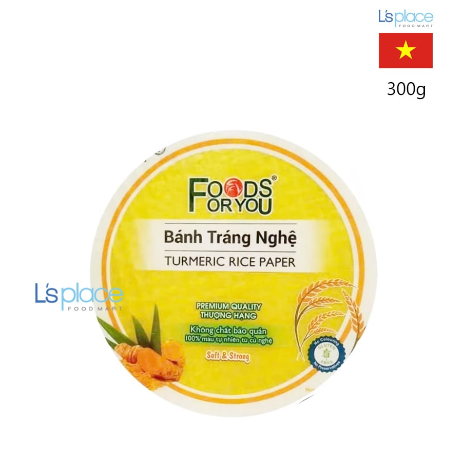Bánh tráng Nghệ của thương hiệu Foods For You được làm từ bột gạo, bột khoai mì và bột nghệ tự nhiên, tạo nên màu vàng bắt mắt đặc trưng. Bánh có kết cấu mềm dẻo, mùi thơm nhẹ từ nghệ, phù hợp để cuốn gỏi, làm chả giò hoặc dùng ăn kèm món khai vị.