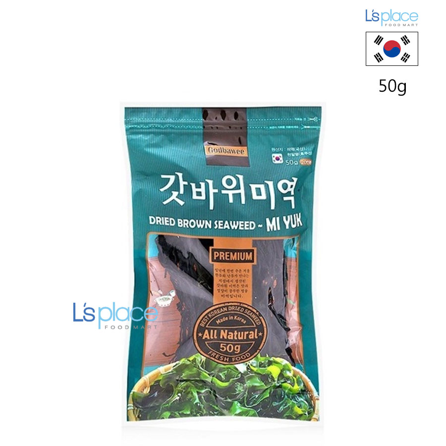 - Rong Biển Godbawee Dried Brown Seaweed Mi Yuk (hay Tảo biển nấu canh Mi Yuk). Đây là loại rong biển khô (thực chất là tảo biển Wakame - phiên âm tiếng Hàn là miyeok) không tẩm ướp gia vị, được dùng phổ biến trong ẩm thực Hàn Quốc, đặc biệt là món canh rong biển truyền thống. Rong biển Mi Yuk rất giàu vitamin, khoáng chất (đặc biệt là i-ốt), chất xơ, và chất lignan, mang lại nhiều lợi ích cho sức khỏe như hỗ trợ tiêu hóa, tăng cường miễn dịch, thanh lọc cơ thể và tốt cho da.Thành phần: