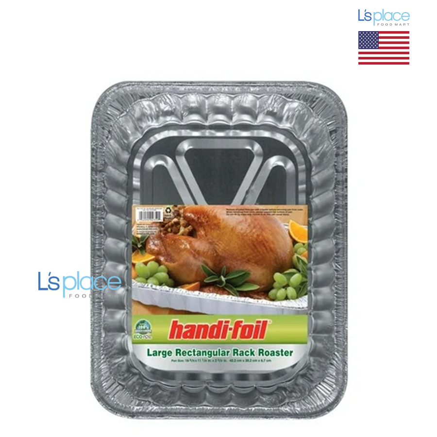 Khay nướng chữ nhật lớn Handi-Foil được làm bằng nhôm dùng một lần, tiện lợi cho các bữa ăn lớn. Sản phẩm thích hợp để nướng gà tây, gà, giăm bông, rau củ và nhiều món ăn khác. Kích thước khoảng 16-5/8" x 11-7/8" x 2-5/8", phù hợp với nhiều loại lò nướng.