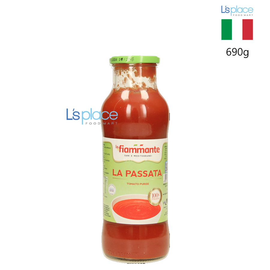 La Fiammante La Passata Tomato Puree là nước sốt cà chua nguyên chất được chế biến từ những quả cà chua tươi chín mọng, trồng tại vùng đất màu mỡ miền Nam nước Ý. Sản phẩm được xay nhuyễn mịn, giữ trọn hương vị tươi ngon tự nhiên và màu đỏ đặc trưng của cà chua chín. Không chứa chất bảo quản hay phẩm màu, La Passata là lựa chọn hoàn hảo để chế biến các món pasta, pizza, lasagna, soup hoặc dùng làm nền cho các loại nước sốt Ý truyền thống.
