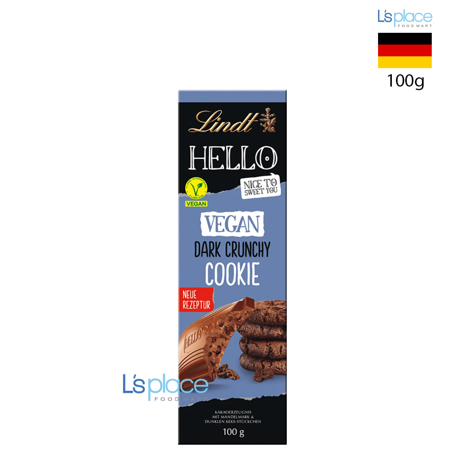 Lindt Hello Vegan Dark Crunchy Cookie là thanh socola đen thuần chay cao cấp, hòa quyện giữa vị đậm đà của cacao nguyên chất và những mảnh bánh quy giòn tan. Sản phẩm mang đến hương vị cân bằng giữa ngọt nhẹ và đắng thanh, cùng kết cấu giòn mịn đầy thú vị – một lựa chọn hoàn hảo cho người yêu socola và theo đuổi lối sống thuần chay.