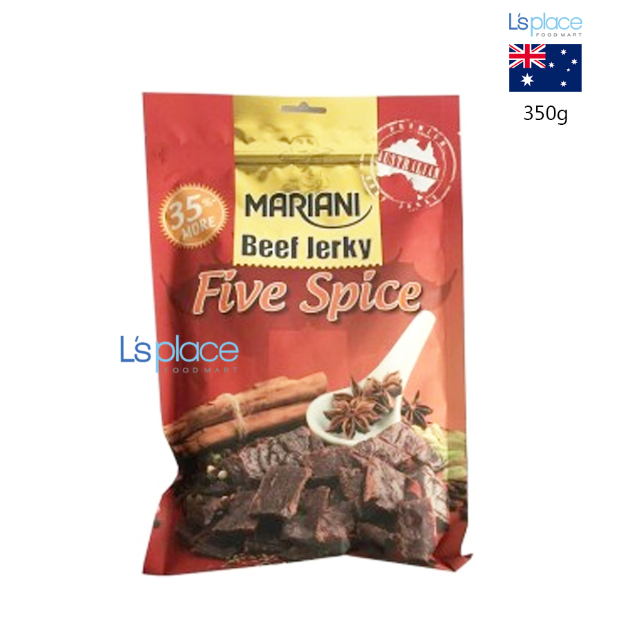 - Mariani là một trong những nhà sản xuất hàng đầu tại Úc về các sản phẩm thịt bò và thịt thú săn sấy khô (jerky) dinh dưỡng và thơm ngon, với lịch sử cung cấp sản phẩm chất lượng cao hơn 30 năm. Sản phẩm của Mariani được làm từ 100% thịt bò Úc cao cấp (Premium 100% Australian Beef), thường là thịt bò ăn cỏ (grass-fed) và chăn nuôi tự do (free roaming), đảm bảo chất lượng xuất khẩu. Thịt bò được tẩm ướp với các loại gia vị đặc biệt, được chế biến chậm, sau đó cắt và thái lát để tạo ra món thịt bò khô mềm, đậm đà hương vị độc đáo.Thành phần: