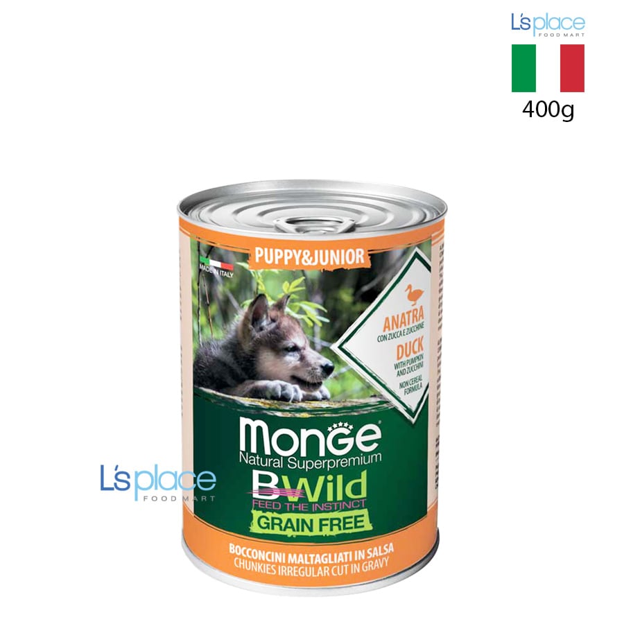 Monge BWild Grain Free Puppy & Junior Pate vị Vịt, Bí Ngô & Bí Ngòi là thức ăn ướt hoàn chỉnh, cân bằng dành cho chó con từ 1 tháng tuổi đến trưởng thành. Sản phẩm không chứa ngũ cốc, sử dụng thịt vịt tươi kết hợp bí ngô và bí ngòi giàu chất xơ. Công thức được bổ sung XOS prebiotics giúp hỗ trợ hệ tiêu hóa khỏe mạnh, glucosamine và chondroitin giúp xương và khớp phát triển, cùng tỷ lệ canxi/fosfor cân đối cho sự tăng trưởng tối ưu.