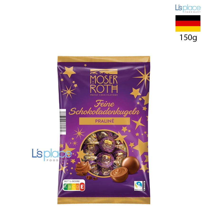 - Moser Roth là một thương hiệu sô cô la cao cấp của Đức, thuộc sở hữu của tập đoàn bán lẻ Aldi. Thương hiệu này nổi tiếng với việc sản xuất sô cô la sang trọng, mang đến trải nghiệm sô cô la thượng hạng với mức giá phải chăng. Sô cô la Moser Roth thường có kết cấu mịn màng, tan từ từ trên lưỡi và giải phóng hương vị sâu sắc. Moser Roth cung cấp nhiều dòng sản phẩm đa dạng, bao gồm các thanh sô cô la đen (thường có hàm lượng cacao từ 70% trở lên), sô cô la sữa, sô cô la trắng, và các bộ sưu tập đặc biệt như truffle và các loại kẹo sô cô la viên (Chocolate Balls/Truffles).Thành phần:
