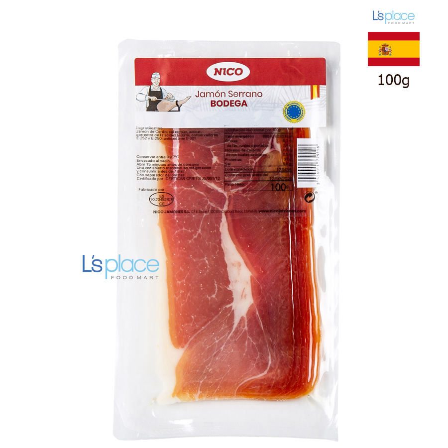 Jamón Nico Jamones Serrano Bodega là giăm bông muối truyền thống của Tây Ban Nha, được sản xuất theo phương pháp ủ khô tự nhiên. Thịt có màu hồng nhạt đẹp mắt, kết cấu săn chắc, vị mặn nhẹ hài hòa và hương thơm đặc trưng của Jamón Serrano. Dòng Bodega phù hợp sử dụng hằng ngày, tiện lợi cho các bữa ăn nhanh hoặc món khai vị kiểu Âu.