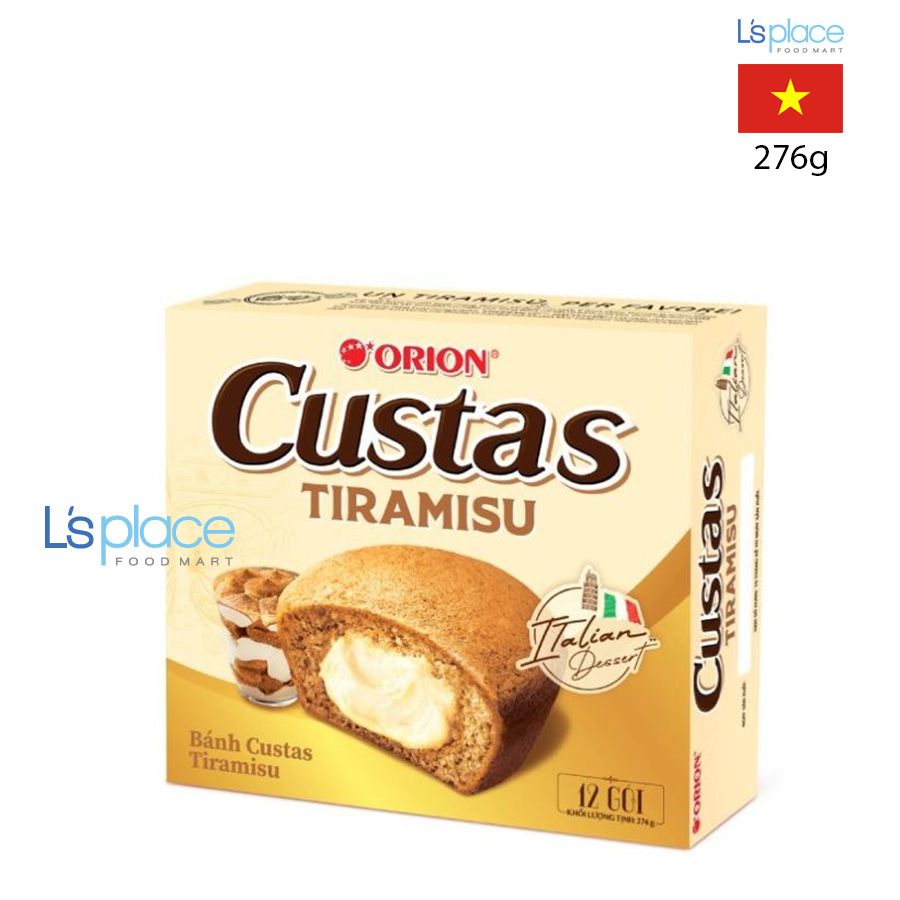 - Bánh Orion Custas Tiramisu là một sản phẩm thuộc dòng bánh bông lan nhân kem nổi tiếng của thương hiệu Orion. Lấy cảm hứng từ món tráng miệng Tiramisu lừng danh của Ý, sản phẩm này mang đến sự kết hợp giữa hương vị truyền thống của bánh Custas và sự tinh tế của Tiramisu. Bánh được sản xuất bởi Công ty TNHH Thực phẩm Orion Vina, một công ty con của tập đoàn Orion Hàn Quốc tại Việt Nam. Bánh Custas Tiramisu có sự hòa quyện của lớp bánh bông lan mềm xốp vị cacao cùng với nhân kem phô mai béo ngậy, ngọt ngào và một chút đắng nhẹ của cà phê.
