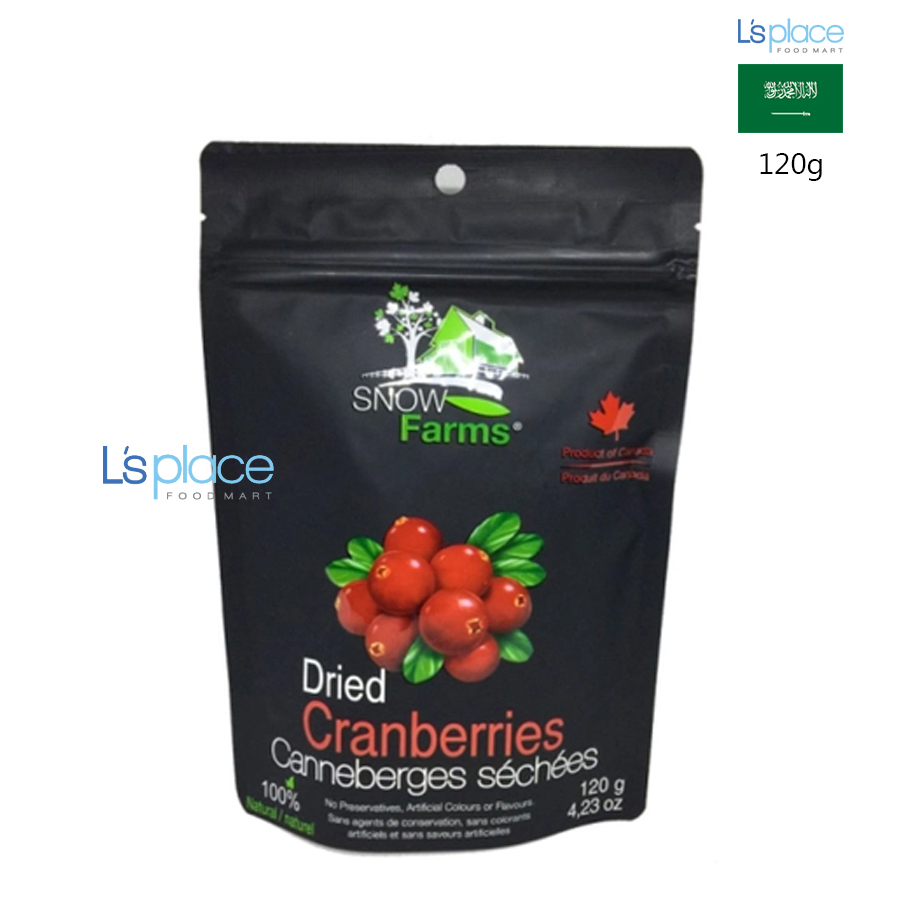 - Snow Farms là thương hiệu chuyên cung cấp các loại trái cây sấy khô (như Nam Việt Quất khô, Việt Quất khô,...) được thu hoạch từ vùng British Columbia, Canada, nổi tiếng với quy trình sản xuất khắt khe theo các tiêu chuẩn quốc tế như HACCP, GMP. Sản phẩm thường được quảng bá là không chứa chất bảo quản, màu hóa học hay hương nhân tạo, không bị biến đổi gen (Non-GMO).Thành phần: