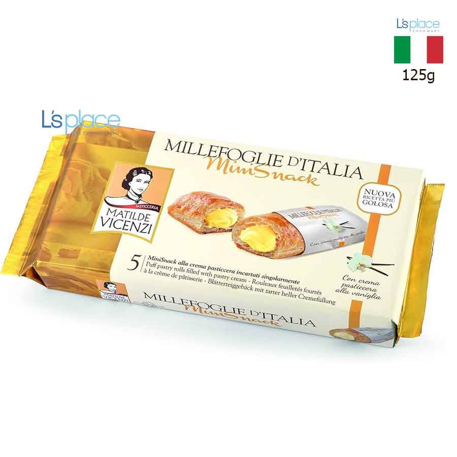 - Vicenzi Minisnack Millefoglie D'Italia Pastry Cream là một loại bánh ngàn lớp nổi tiếng của thương hiệu Matilde Vicenzi đến từ Ý. "Millefoglie" trong tiếng Ý có nghĩa là "ngàn lớp", mô tả chính xác kết cấu đặc trưng của loại bánh này. Bánh được làm thủ công, với hàng trăm lớp bột mỏng xếp chồng lên nhau, tạo nên độ giòn, xốp đặc trưng.